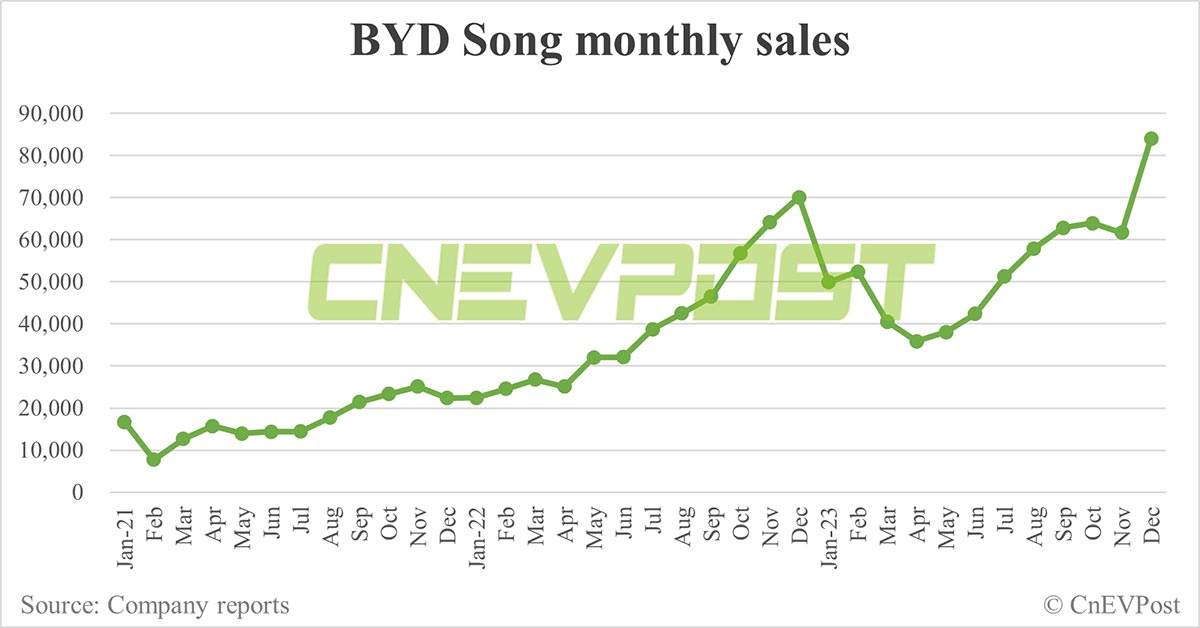 BYD’s Dynasty series of Song models sold 33,314 units in December, up 63.97 percent from 20,317 units in November.
