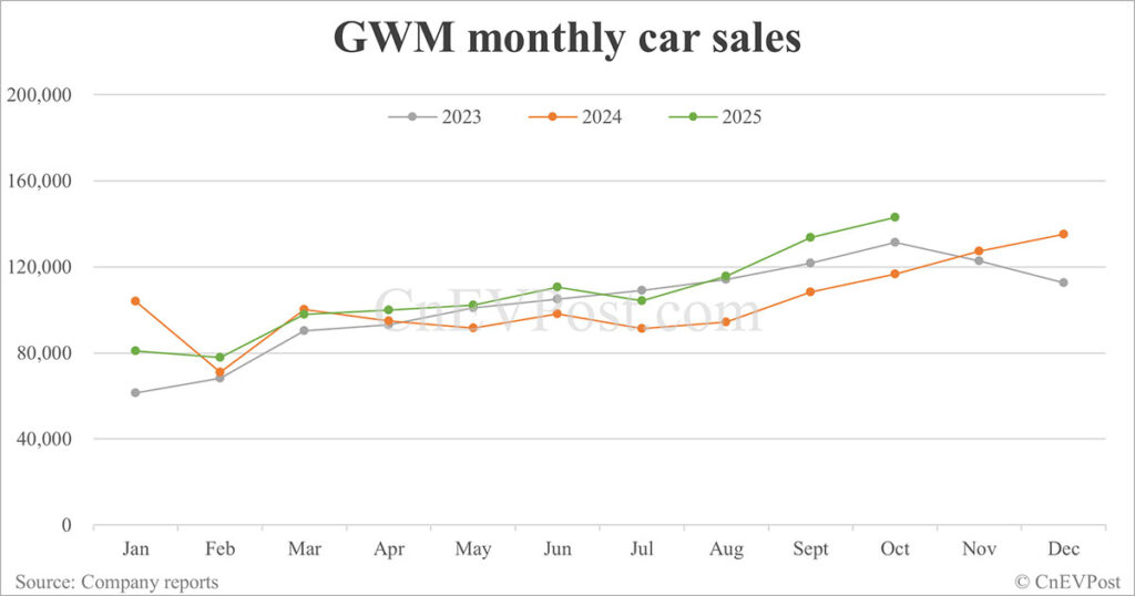 GWM’s overseas sales reached 57,158 units in October, marking the third consecutive month of record highs and accounting for 39.95 percent of total sales. This represents a 28.68 percent year-on-year increase and a 13.70 percent rise from September.